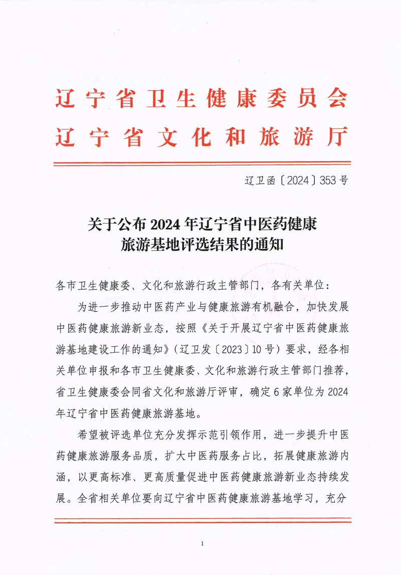恭喜抚顺青松药业获得辽宁省卫生健康委员会、辽宁省文化和旅游厅颁发的2024年辽宁省中医药健康旅游基地。